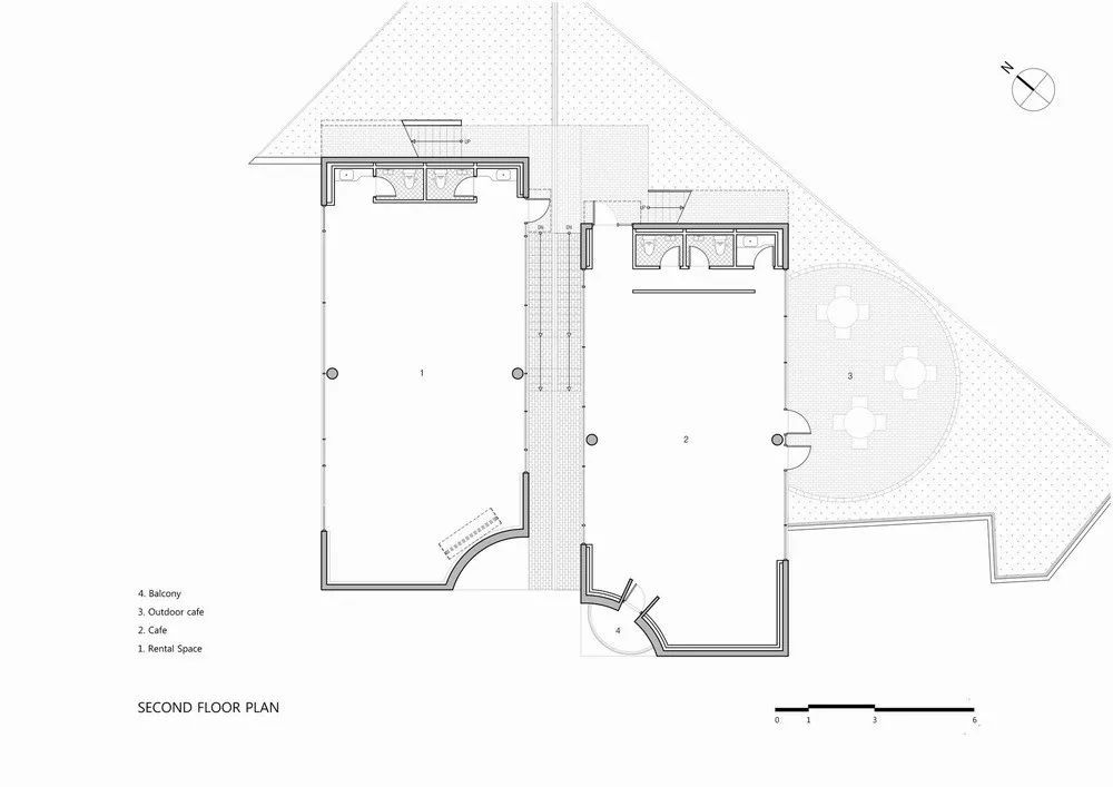 方案灵感来源于一部电影,希望能打造一个在咖啡店和画廊环绕之中的私人文化中心。建筑正立面上,方形体量如同经历了一次球体的撞击,留下了两个大小不一的凹陷。凹陷的空间有如明月,可以从不同的角度观赏,呼应着建筑设计的主题。